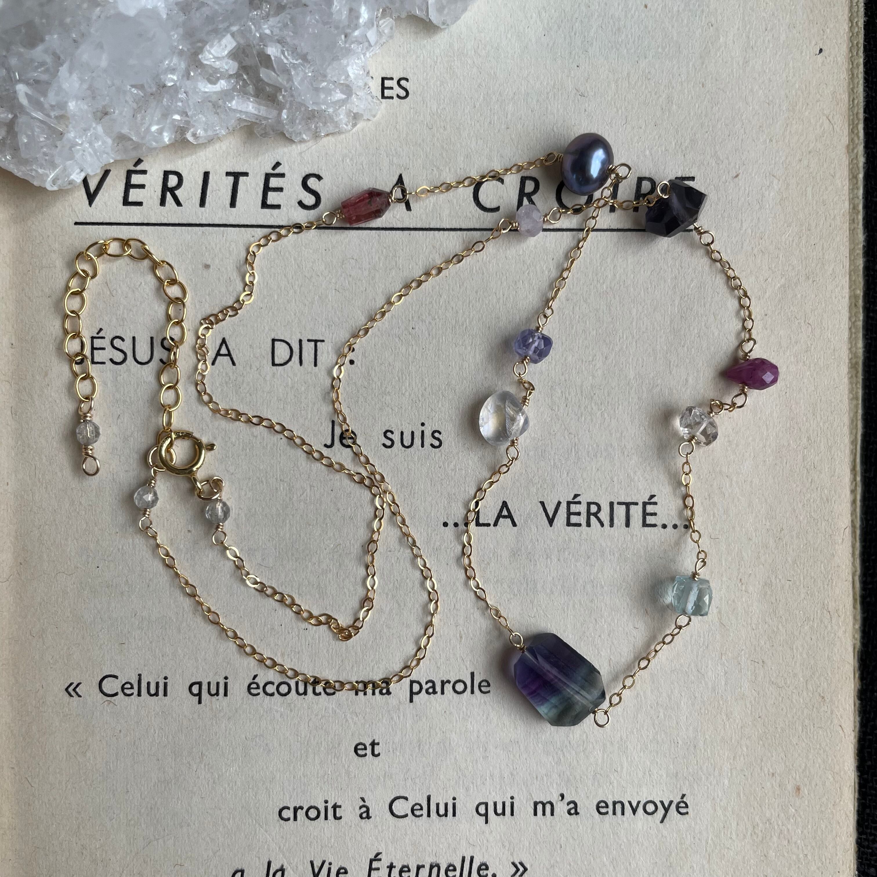タンブルカットのフローライトを中心に色や形の異なる天然石を繋いだネックレス。
