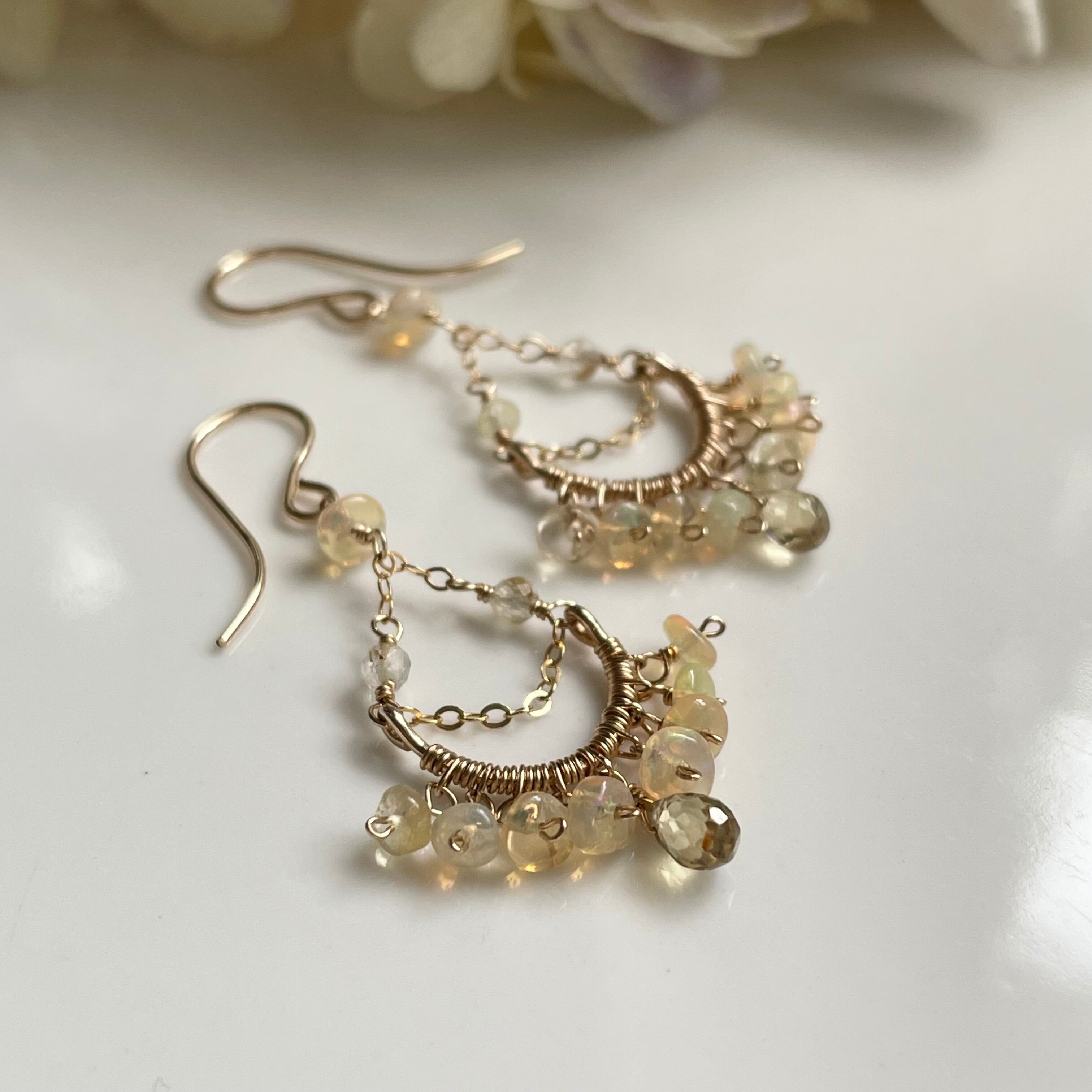 幻想的な色合いのオパールをたっぷりと繋いだシャンデリアのようなピアス。