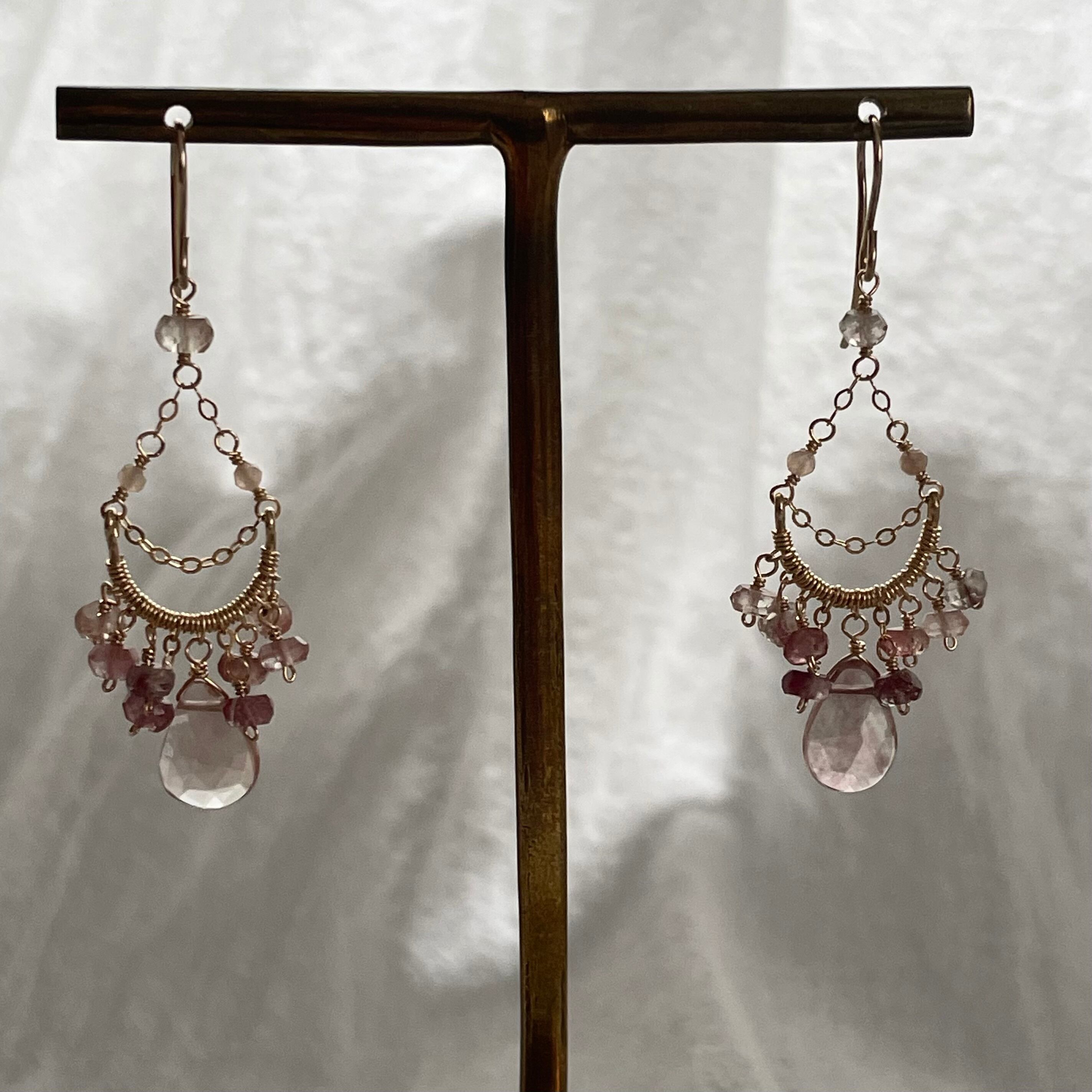 神秘的な色合いのアンデシンをたっぷりと繋いだシャンデリアのようなピアス。