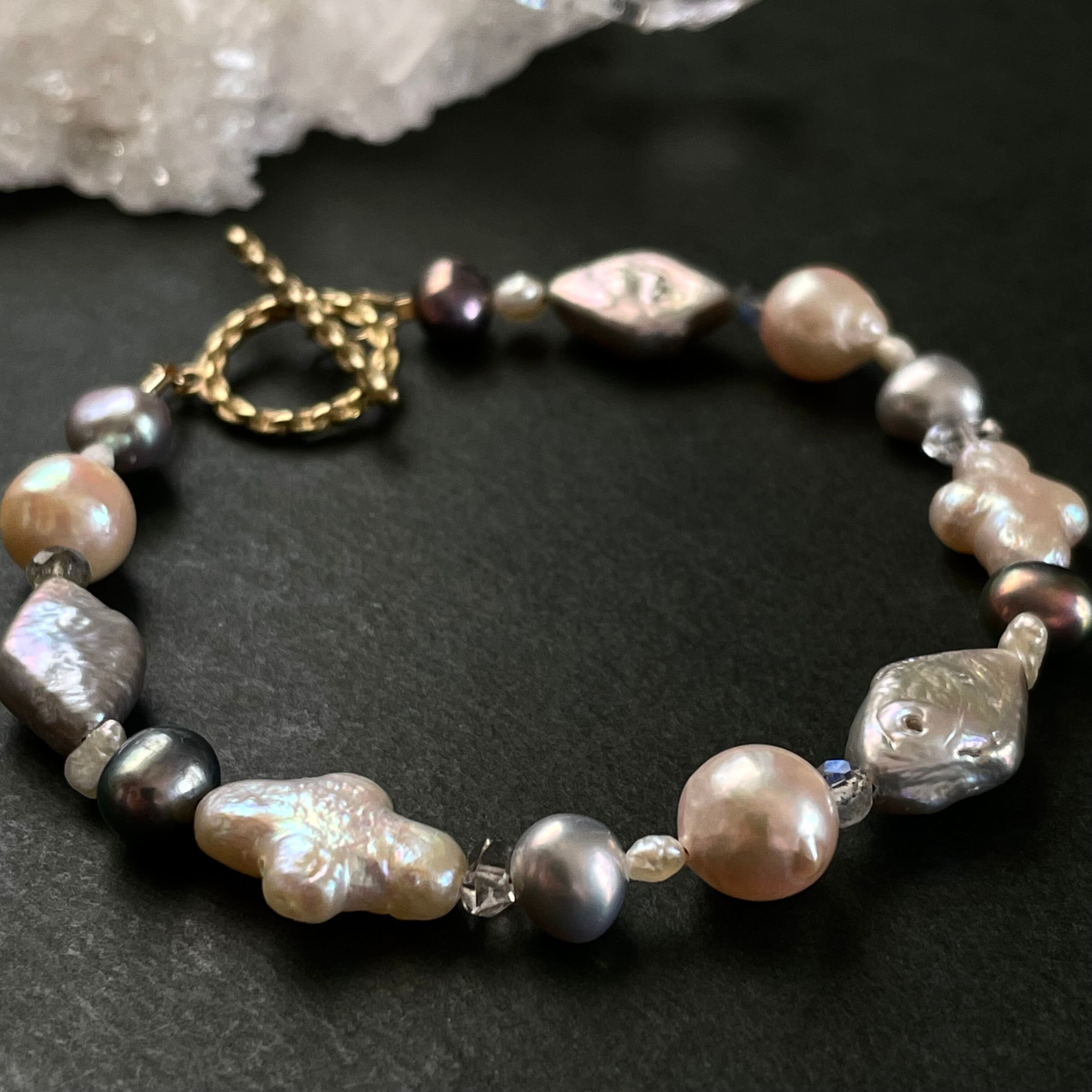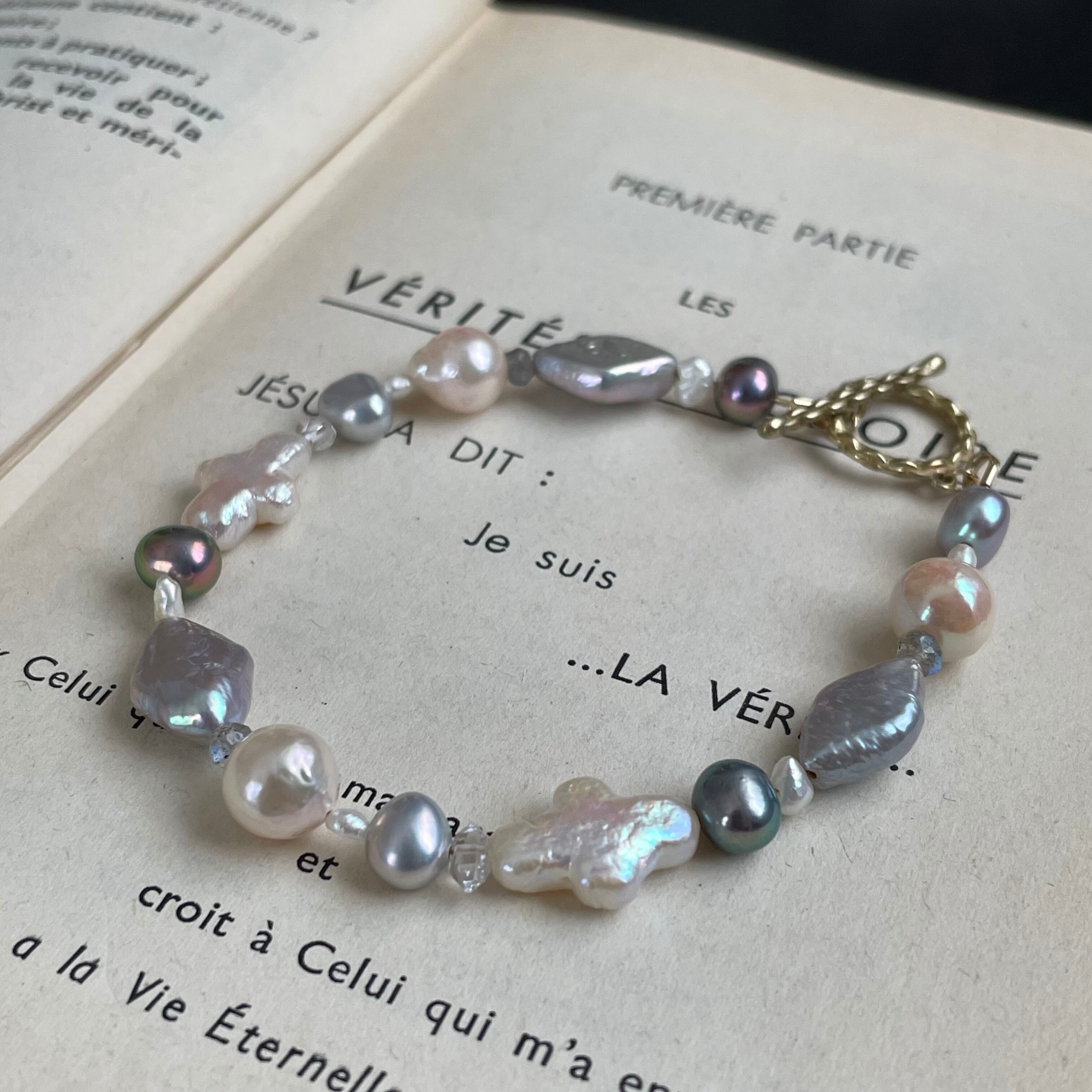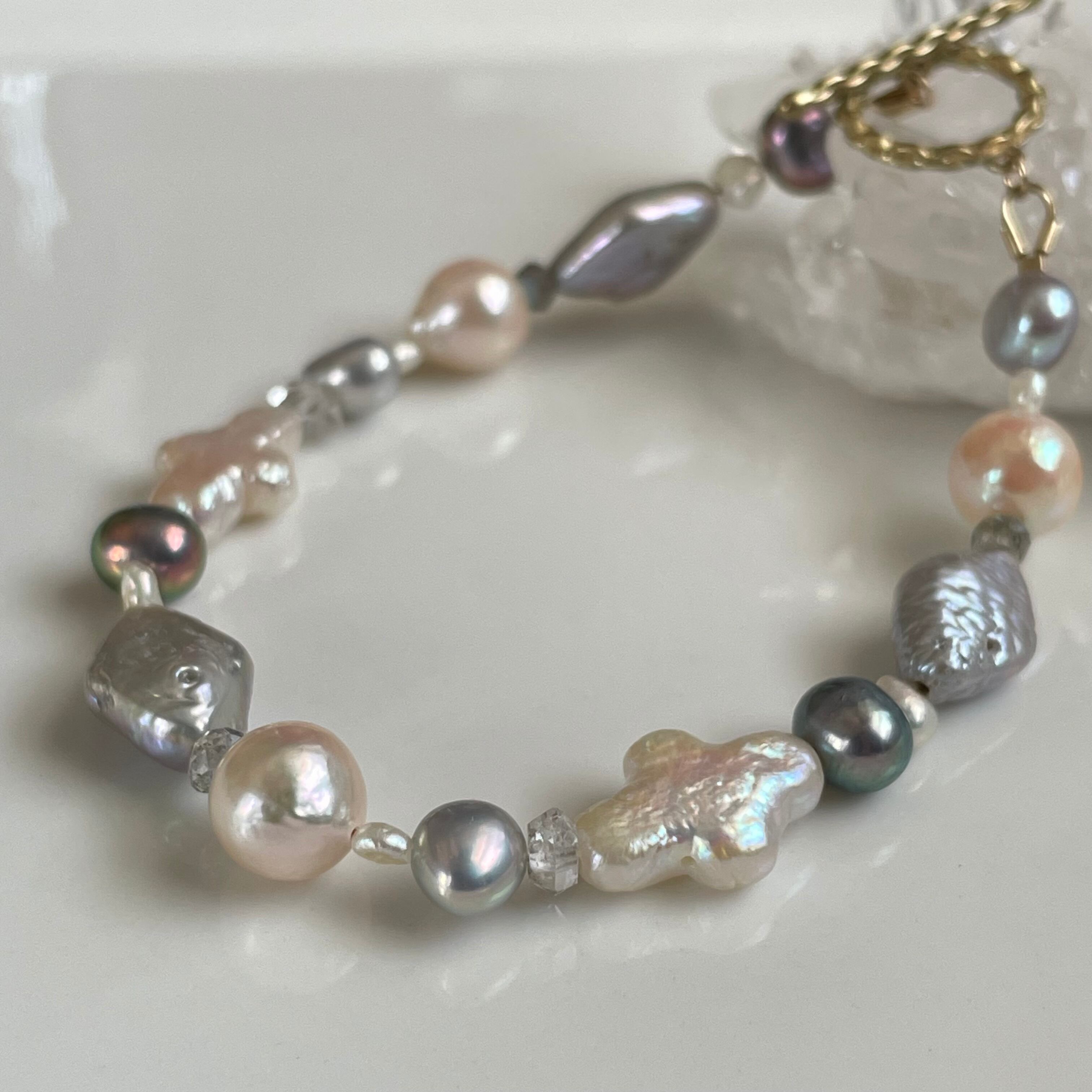 さまざまなパールをリズミカルに繋いだブレスレット。