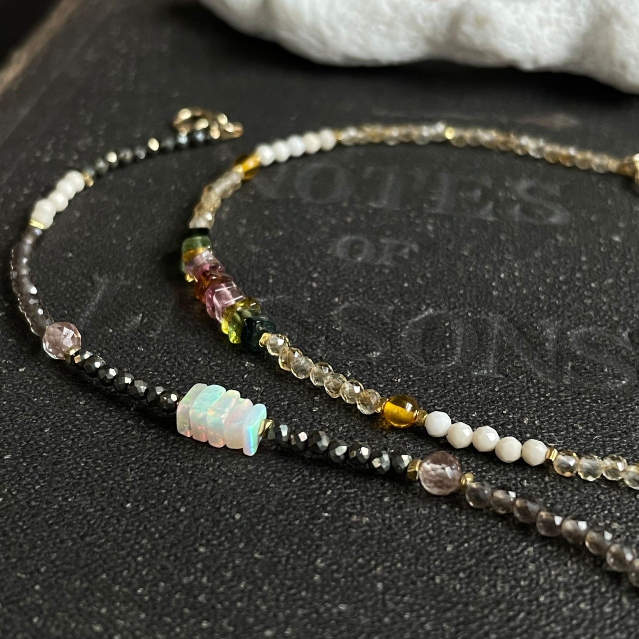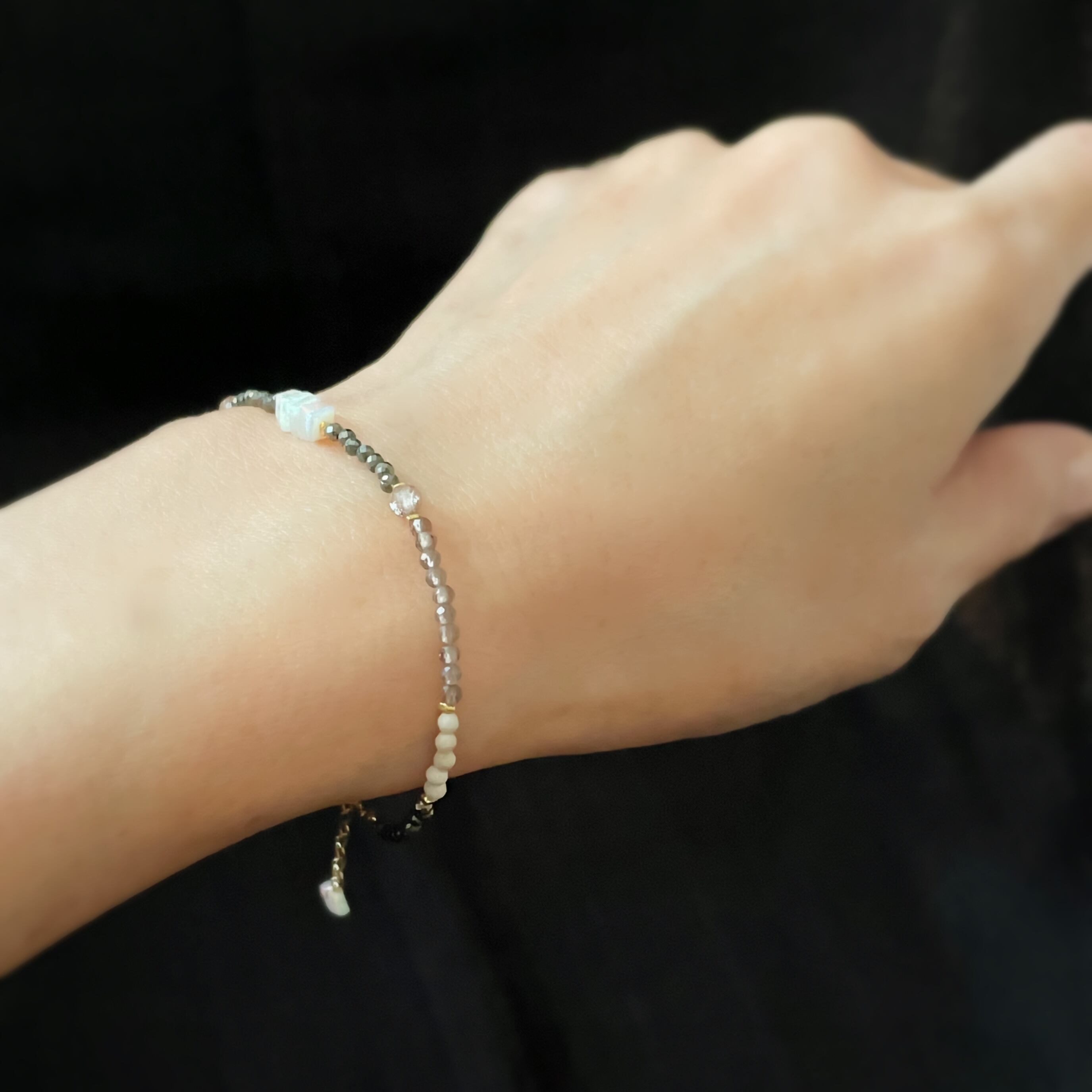 オパールを中心に極小粒の天然石を繋いだ華奢なブレスレット。