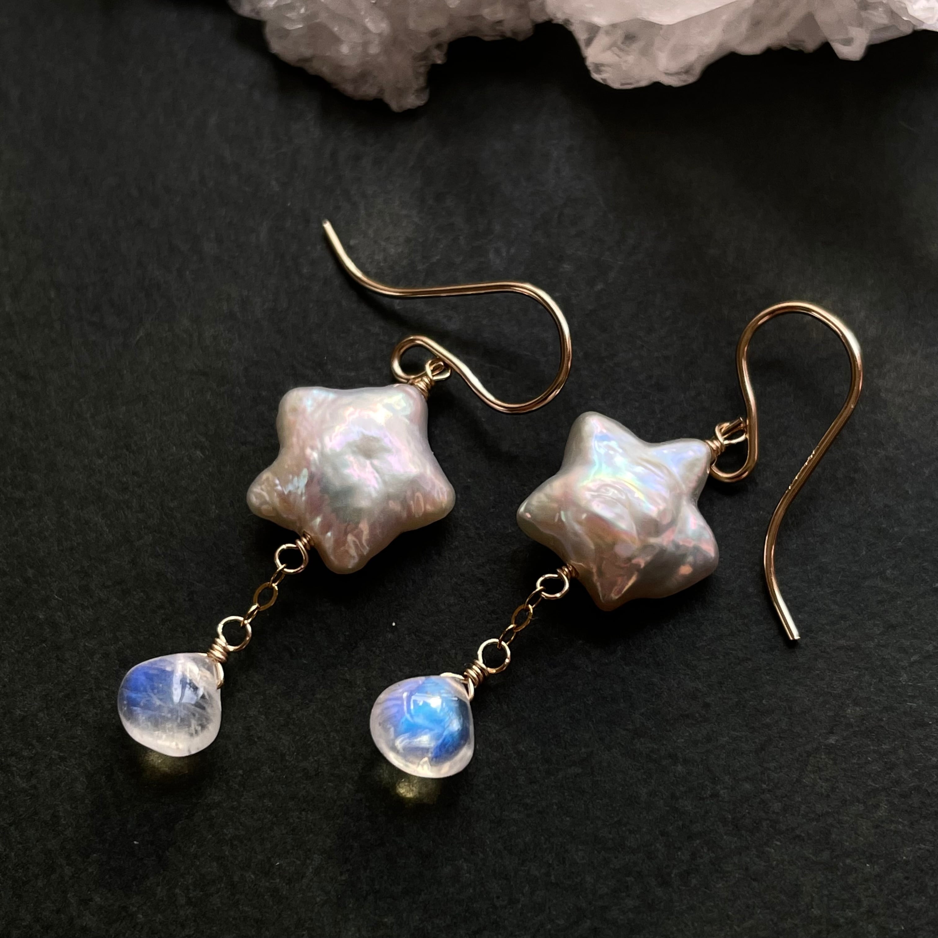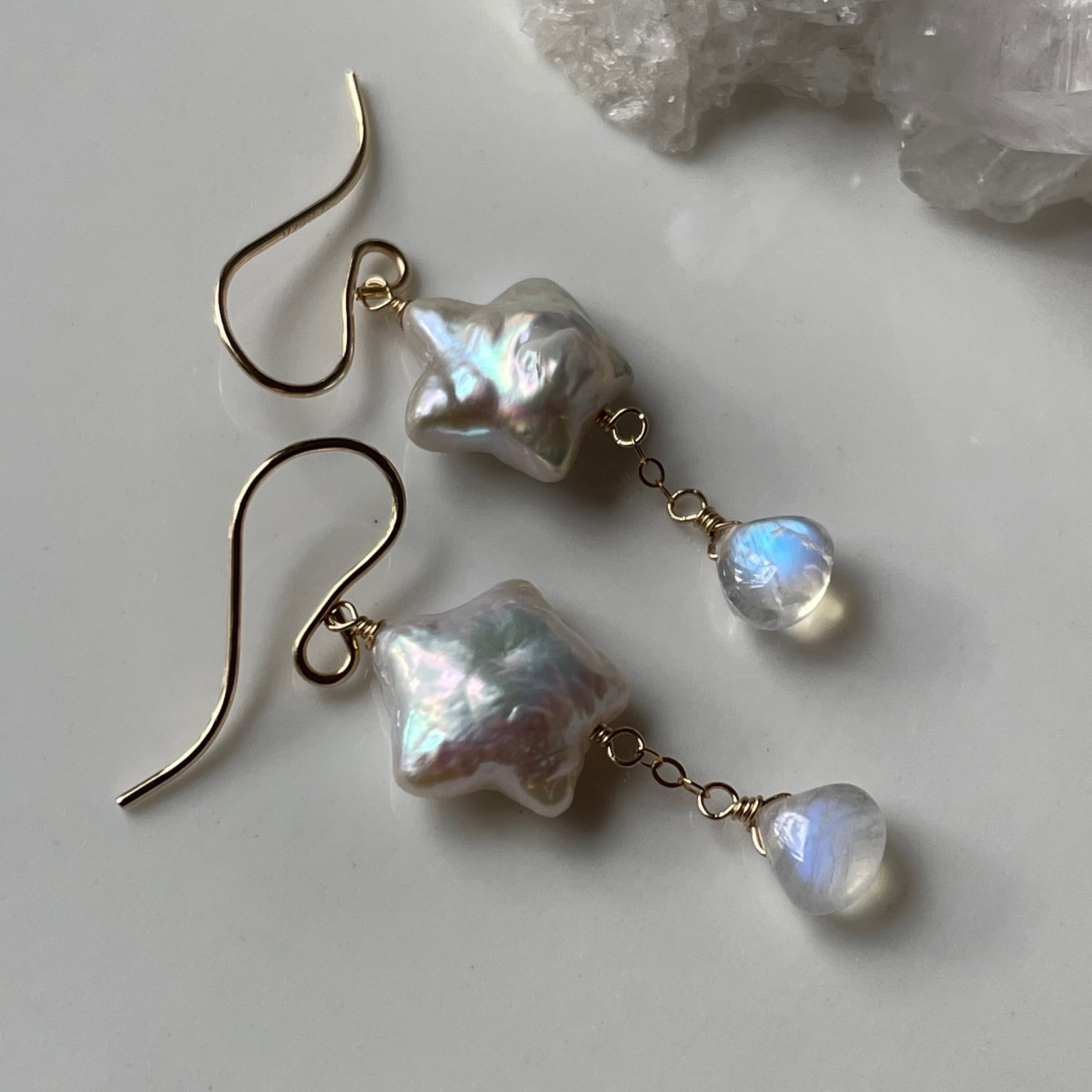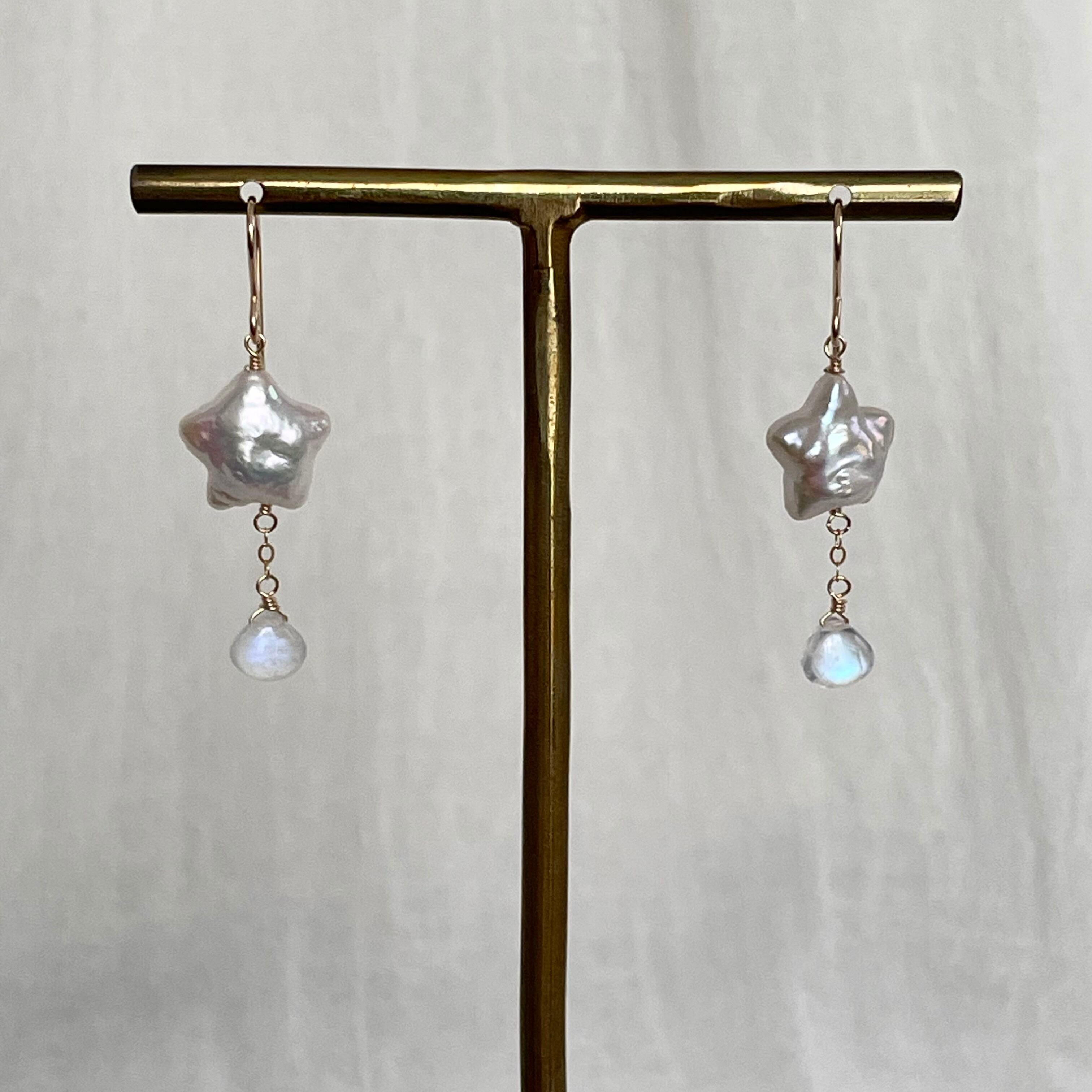 星形の淡水パールとムーンストーンを繋いだ揺れるピアス。