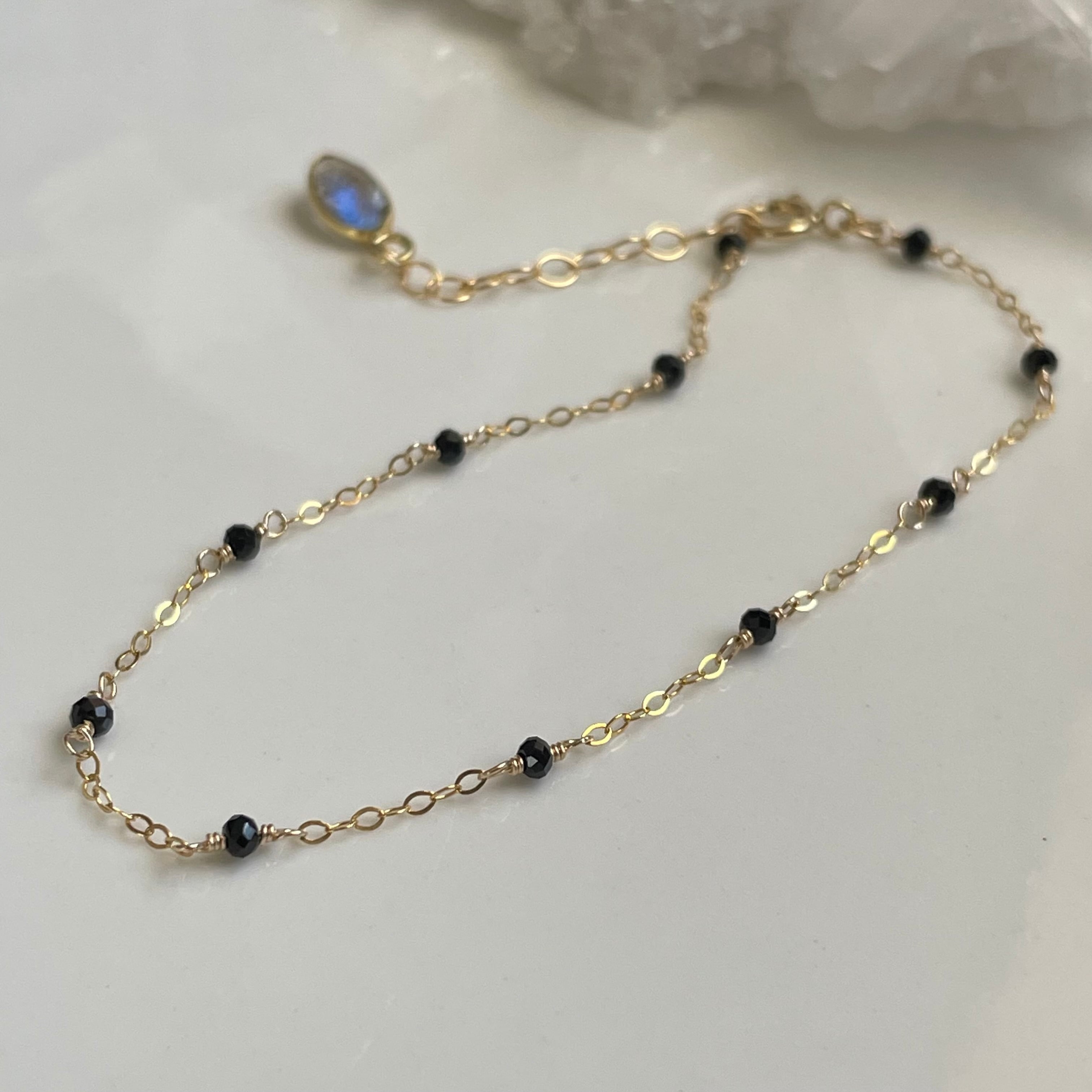 極小のブラックスピネルを華奢なチェーンに繋いだブレスレット。