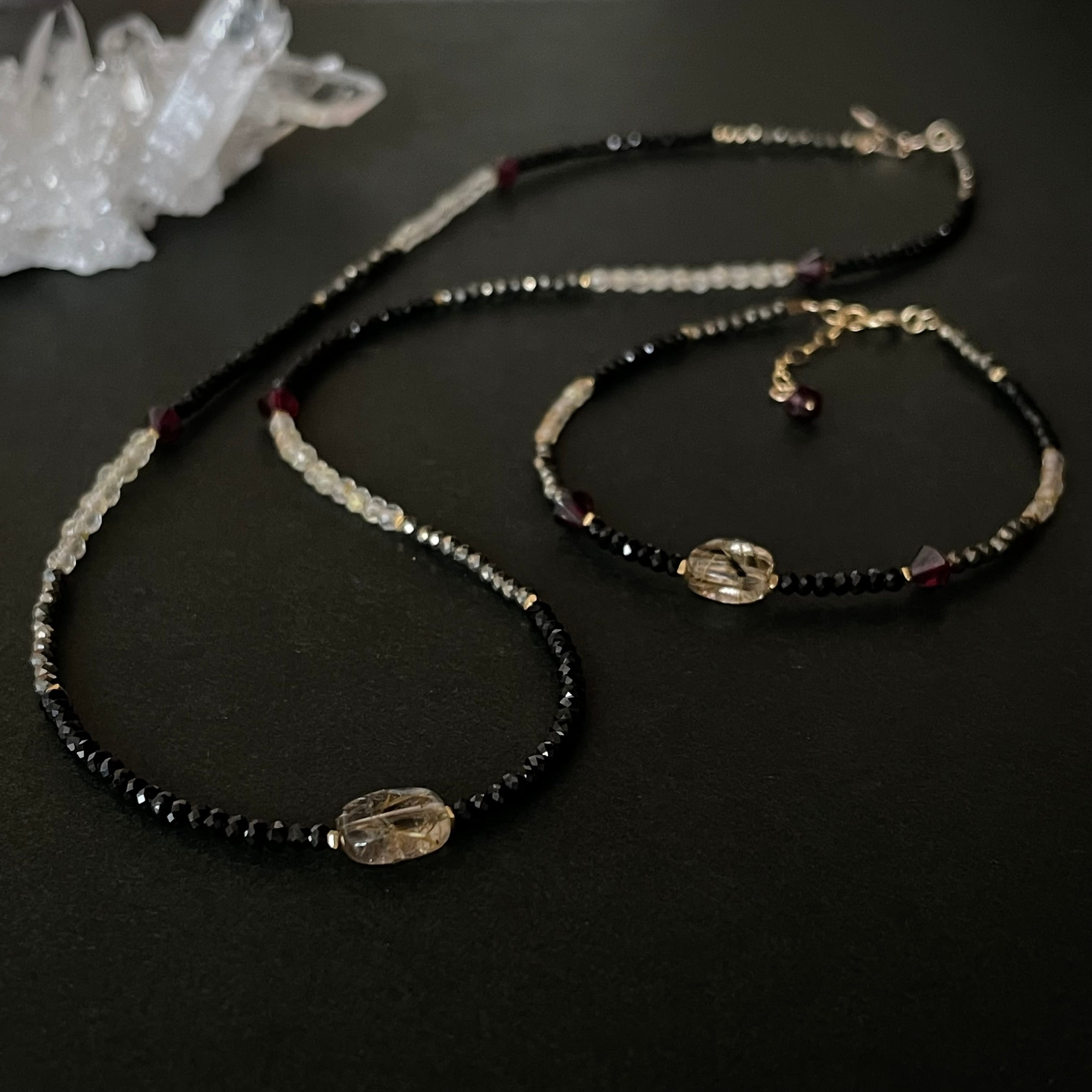 透明感のあるルチルクォーツや深紅のガーネットをアクセントに、漆黒に輝くブラックスピネル、鈍い輝きのパイライトを繋ぎ、ラフな風合いが魅力的なカレンシルバーを挟みました。