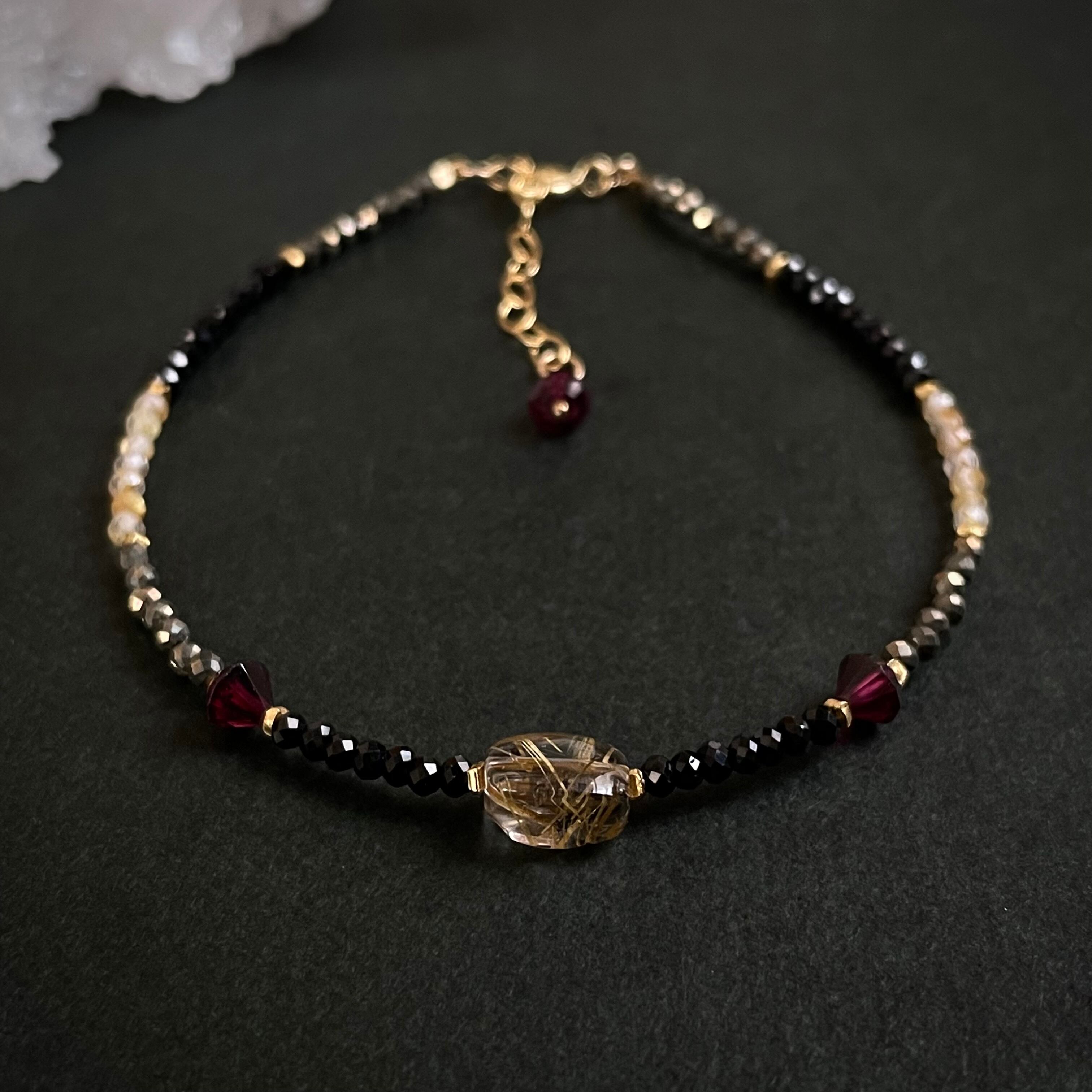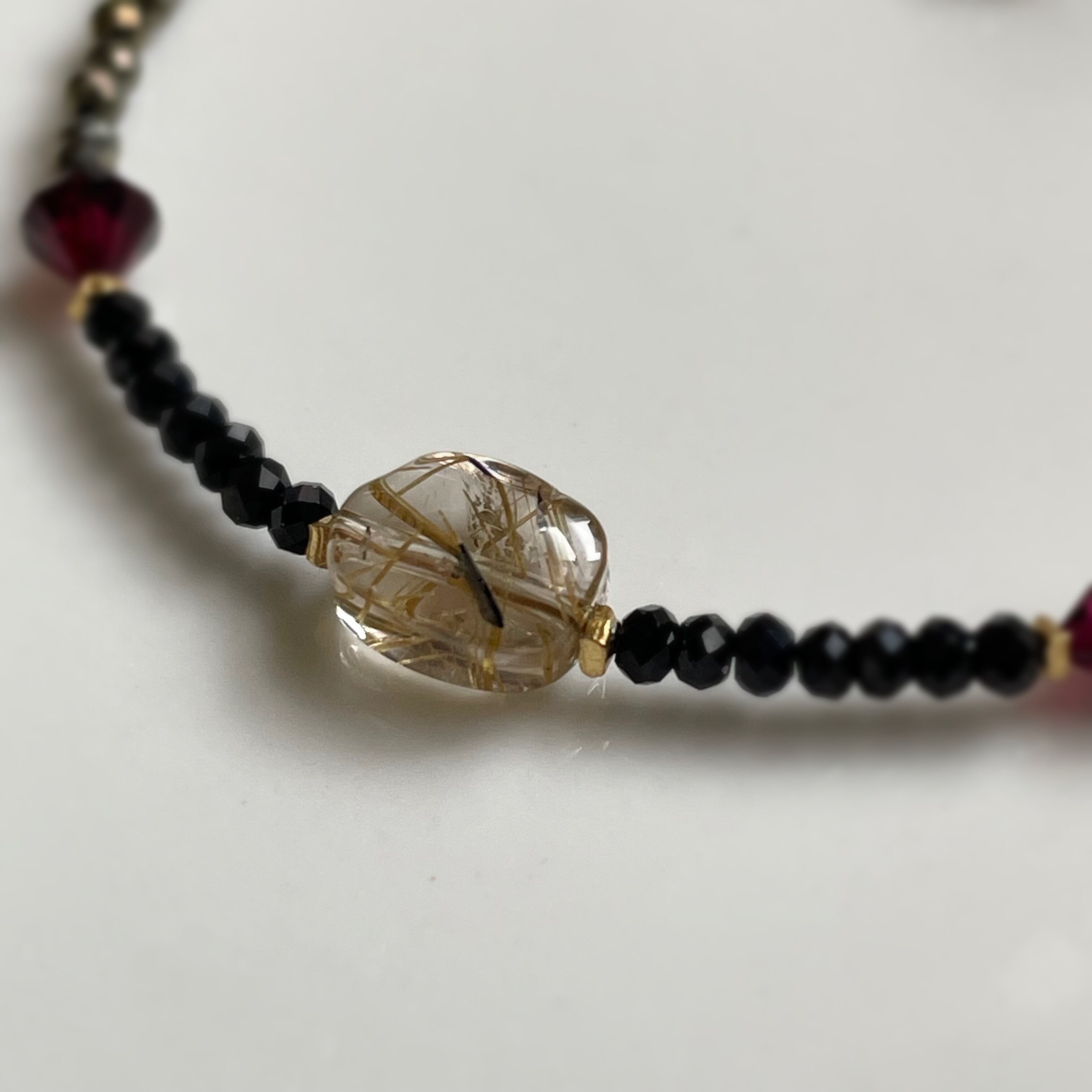 14kgf ルチルクォーツ×ガーネット×ブラックスピネル×パイライト ブレスレット